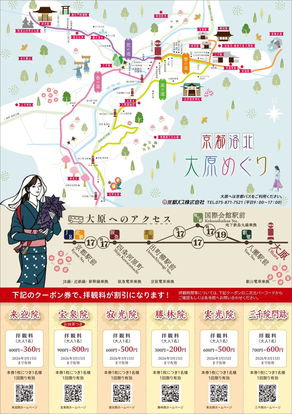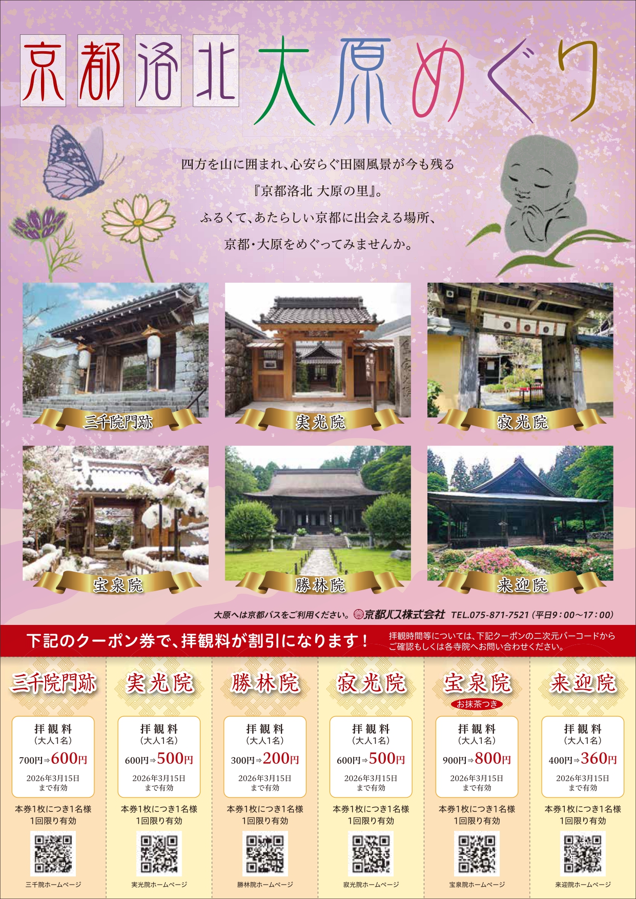 1月16日(金)から3月15日(日)の期間、大原地域の6社寺を割引料金で拝観いただける特別優待券を、京都バス車内をはじめ、京阪電車主要駅、京阪電車プレミアムカー車内などで配布いたします。